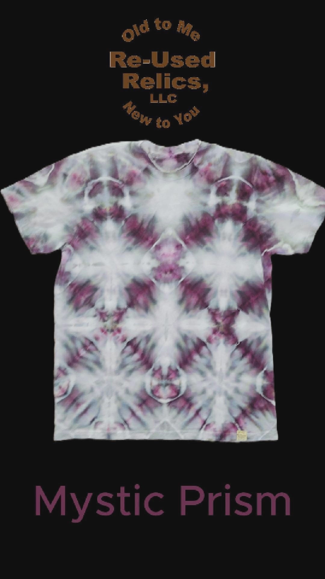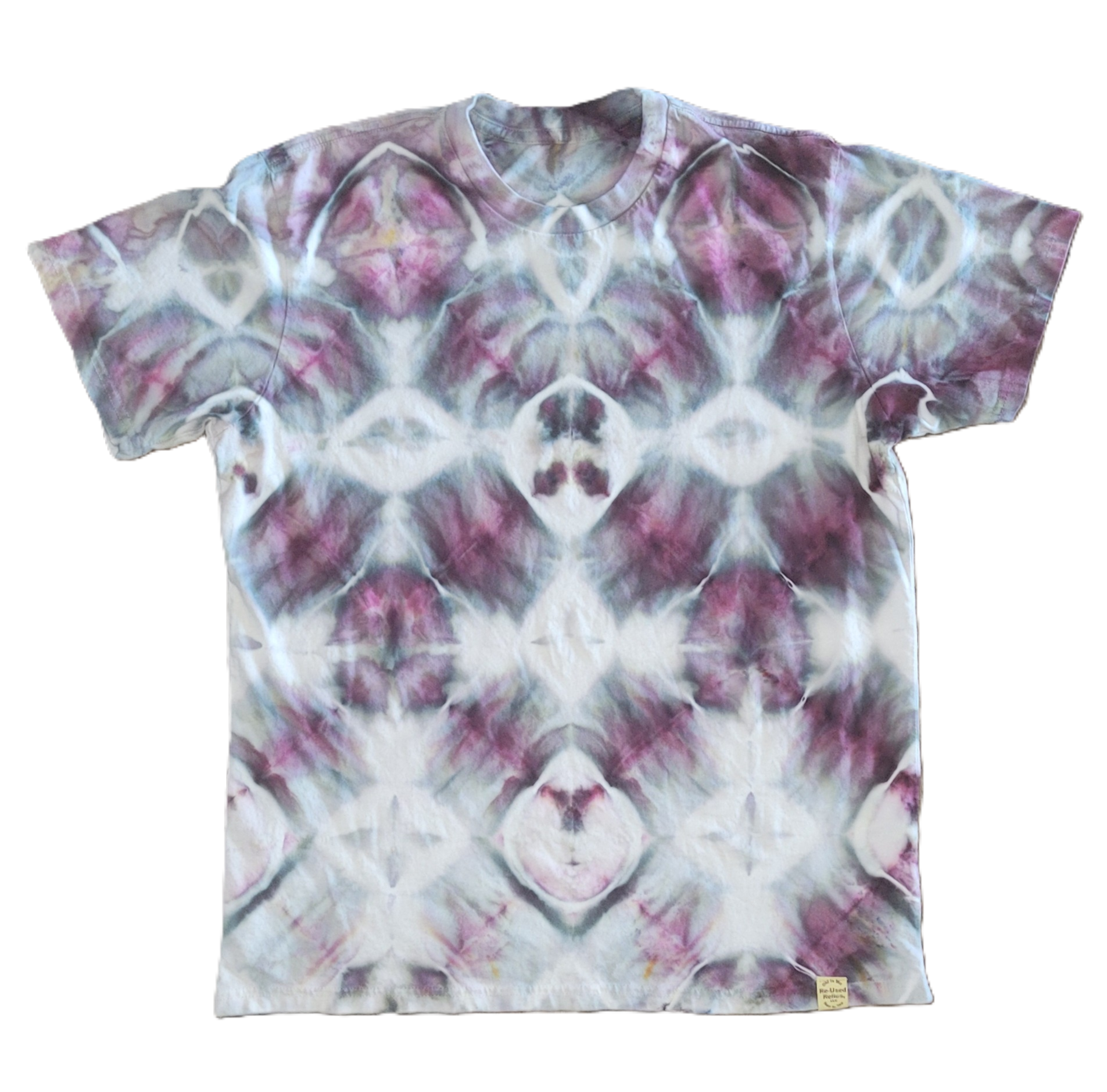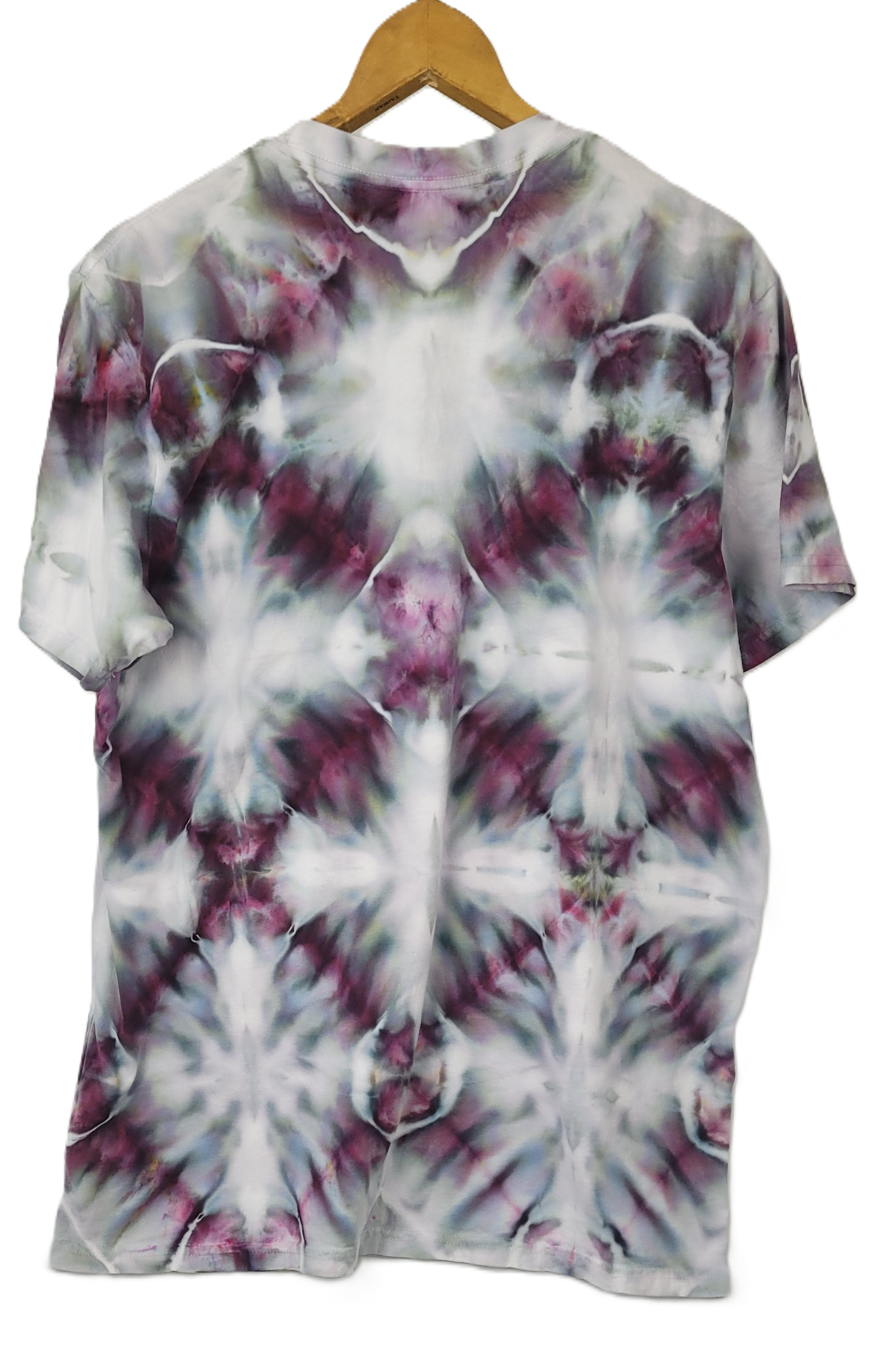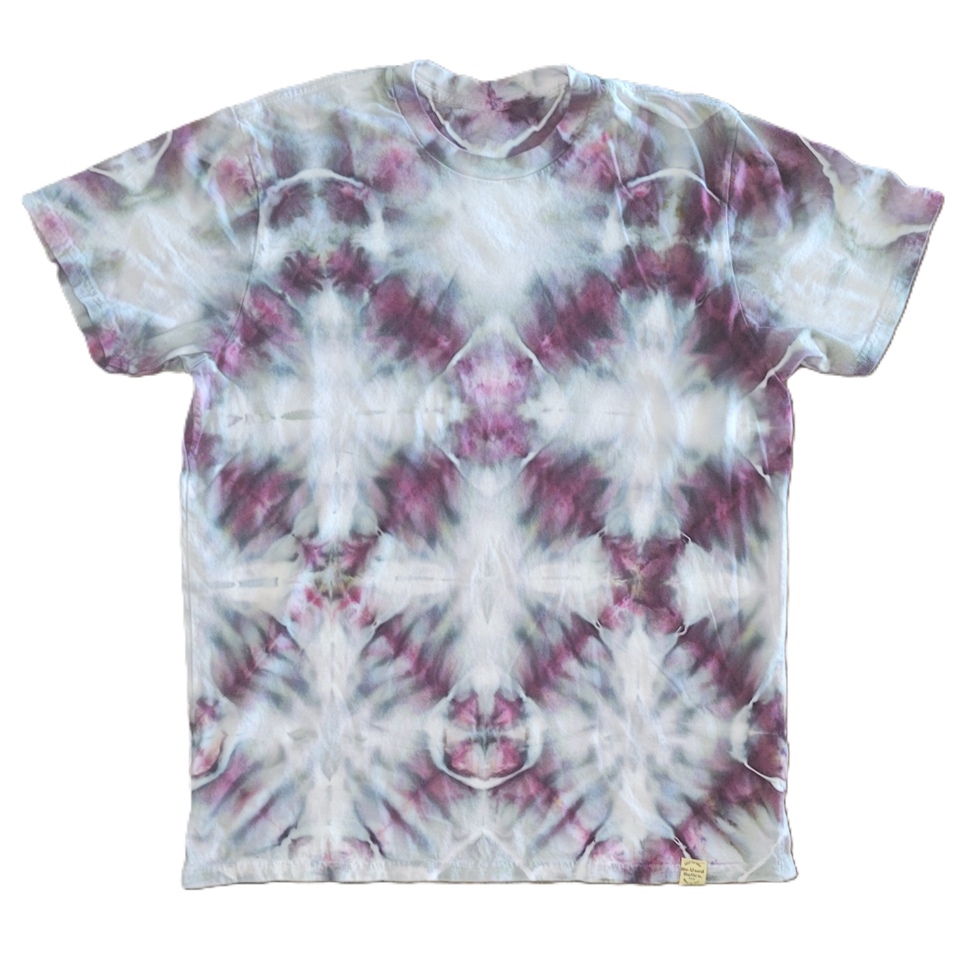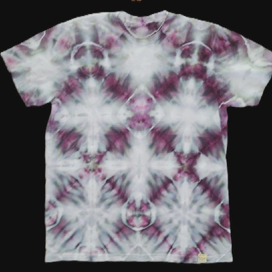 Elevate your casual style with our one-of-a-kind, handmade tie-dye t-shirt. Featuring a stunning symmetrical design reminiscent of a faceted crystal or a blooming nebula, this shirt showcases a unique blend of deep purples and soft grays against a clean white backdrop.