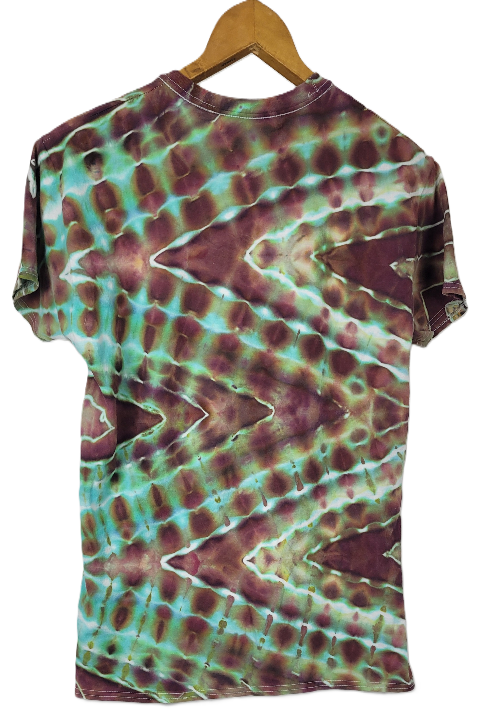 Bring a pulse of energy to your wardrobe with the Primal Rhythm ZigZag. This wearable masterpiece features a hypnotic "side-V" or zigzag design that flows across the entire garment, creating a rhythmic, scale-like appearance. Hand-crafted on 100% cotton, the earthy tones are punctuated by sharp, vibrant pulses of teal and seafoam green, all defined by crisp white resist lines.