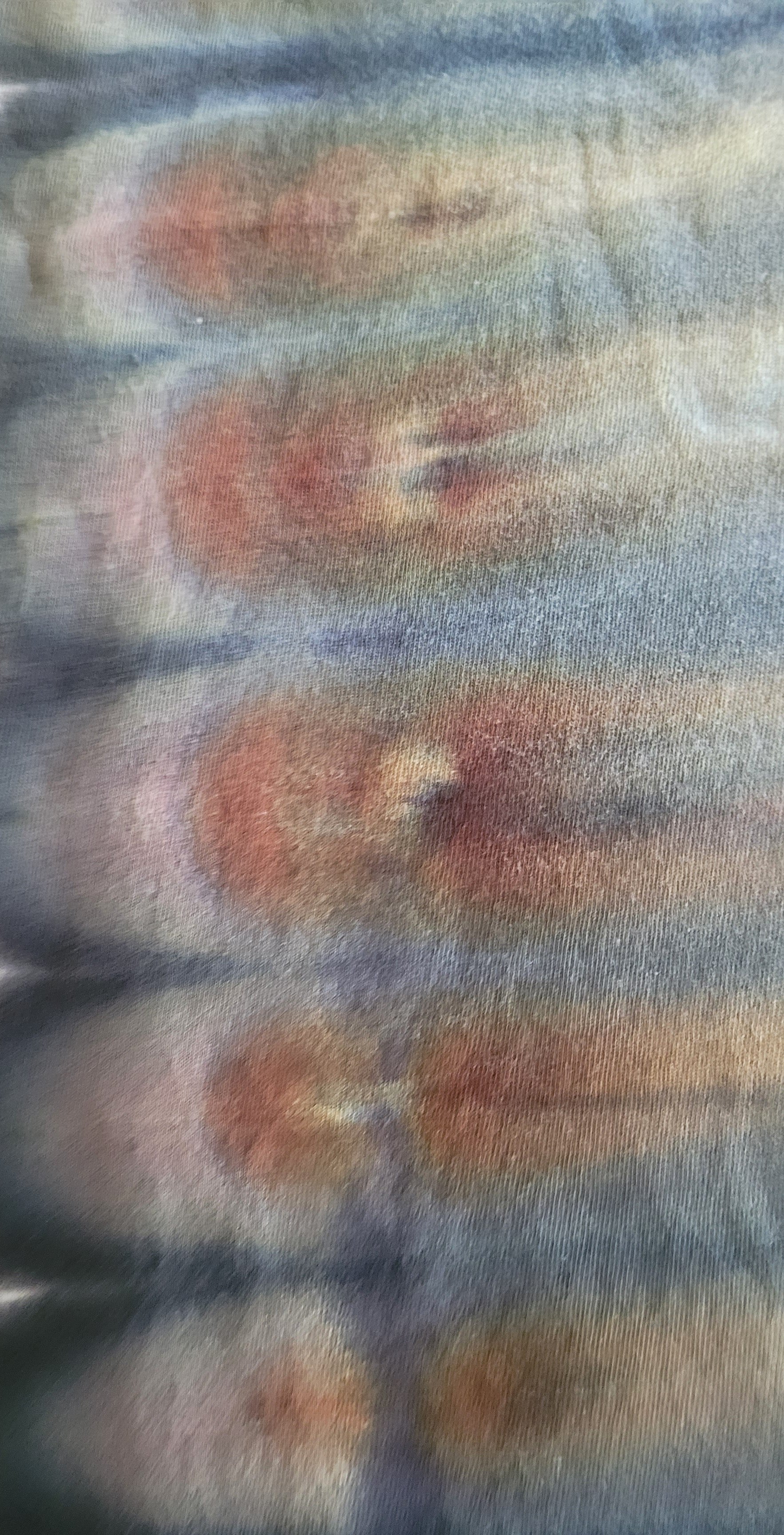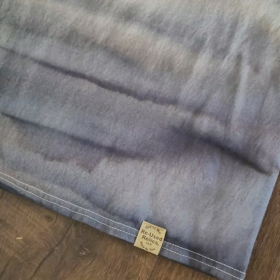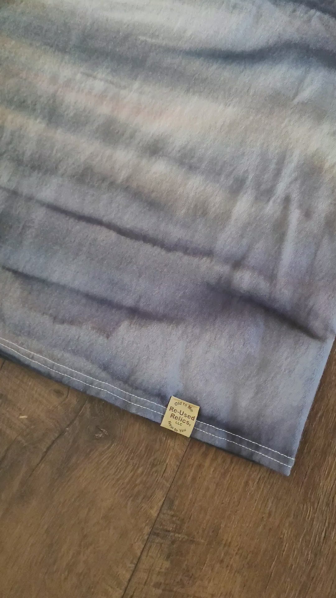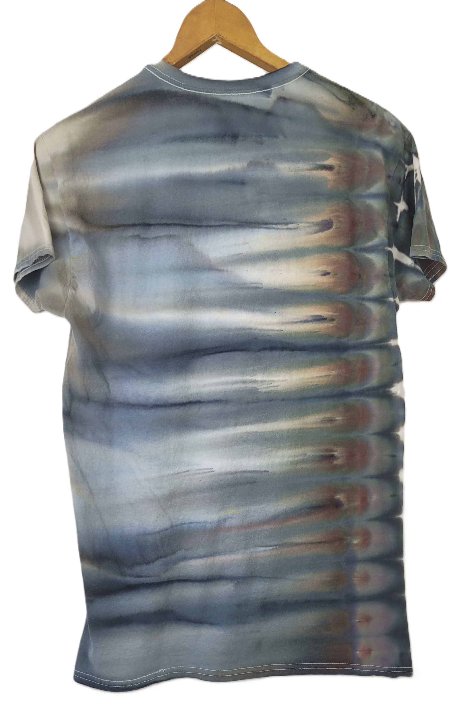 This one-of-a-kind tie-dye t-shirt features a striking side flow ice dye design, creating a unique visual effect of horizontal stripes and soft color transitions. The custom design showcases a blend of cool grays, deep blues, and subtle hints of warm reddish-brown, reminiscent of a flowing river or a weathered rock face. Each shirt is a completely unique work of wearable art, with no two designs being exactly alike.